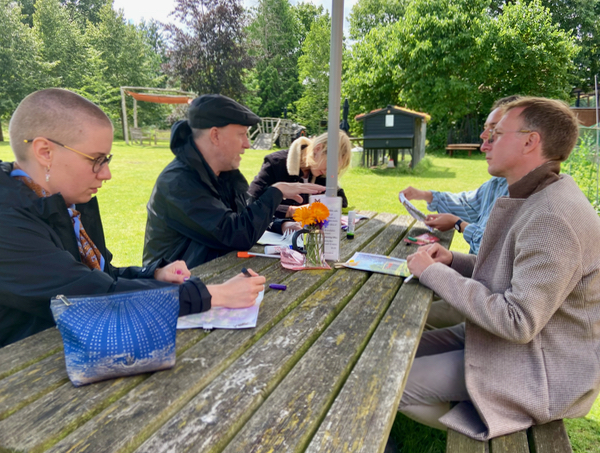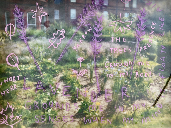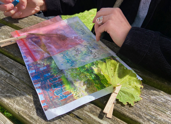 As part of the day I ran a workshop sharing my Walking Pages process and inviting the artists, exhibition coordinator Joe Jukes and Queer Rural Connections originator Timothy Alsopp, to layer their experiences of the MERL’s garden, onto printed photographs. The intention was to give people a chance to explore how we can document queer experiences of place, and consider how these might differ from mainstream representations.