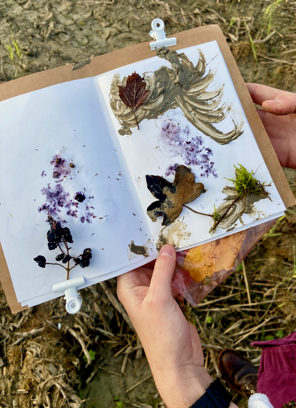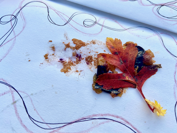 Our conversation and walk was accompanied by the noticing of different sizes and colours of leaves or the wording on signs, discussions on the approach and image of different ‘nature writers’ or artists, and the role of arts-based methods in research. I was happy to watch the way Joe used the walking pages, squashing and rubbing berries, drawing in response to surrounding features, and to listen to their thoughts on water and memory.