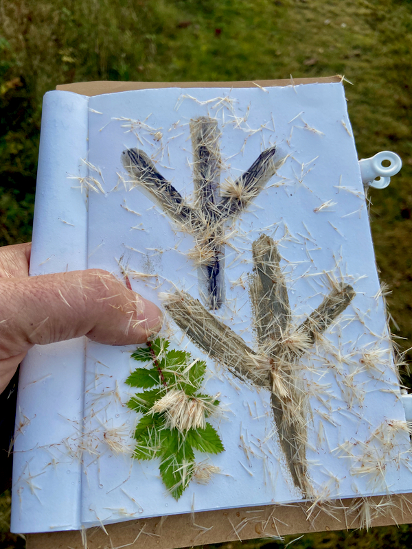 We continued on to end our walk (before a return trip to the car park) in the area of the reserve that is accessible to the public, stopping to look for footprints and to dip our own fingers into the clay scraped by a digger to open up the water, blowing at floaty reed mace seeds, and working into our pages as we followed a path around the lake.