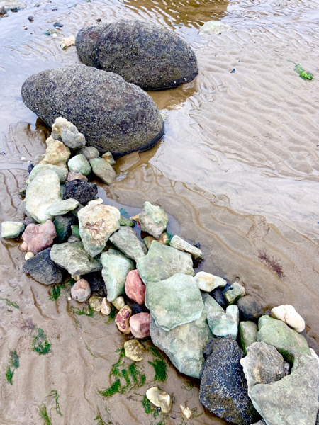 Walking from Hunstanton, past Old Hunstanton towards Holme, I started to notice channels of fresh water cutting through the sand dunes as the Hun made its way along behind them and opened out into The Wash. Spending a few hours exploring the beach and swimming in the sea with my son and dog, I gathered together a few finds from the high tideline, including a massive old mussel shell and a holey whelk shell, to take home to Wiltshire.