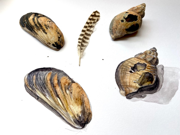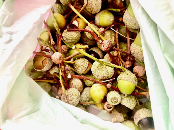 Once home I decided to draw/paint them using the ink I’ve been making from plant material that I’ve collected near my own chalkstream, the Salisbury Avon (near its headwaters in the Vale of Pewsey). Having made Dock Seed, Ragwort Flower and Black Walnut ink recently, I collected acorns with my husband on our first walk back in Wiltshire, and used them to make a new dark grey ink, together with some rust from an old trough.