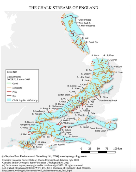 I enjoyed the sense of bringing the two chalkstreams together, through my noticing and my drawing, physical acts that reminded me of a map of chalkstreams in the UK shared by Tim Sykes, which shows a band of chalk spreading upwards from the South West to East Anglia and above (map included at end of post).