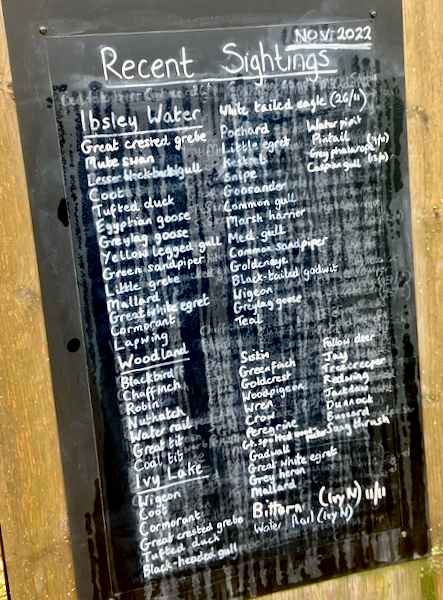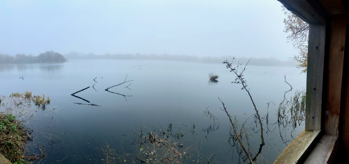 We could only see a little way across the lake because of the fog, and were joined by a few people who came and went in frustration, at not being able to spot birds through the white hazy water droplets. I enjoyed the thought that we were breathing in the water, and the effects that were created by the fog in terms of sound and vision, as Widgeon and Coots called out from the whiteness, and reflections rippled with the breeze.