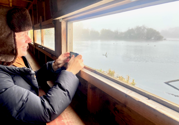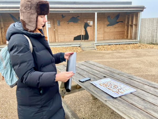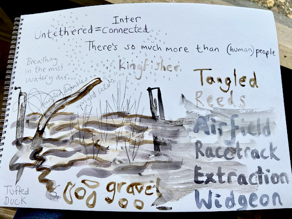 After parking my car in the car park we followed the gravel paths around the site, pausing at bird hides to eat chocolate hobnobs and share sources of inspiration, from talks by Astrida Neimanis, to the What is a River? illustrated book by Monika Vaicenavičiene. On our way we caught glimpses of a kingfisher through willow branches, looked at a blackboard list of recent bird sightings, and discussed the practicalities of living and working as an autistic artist.