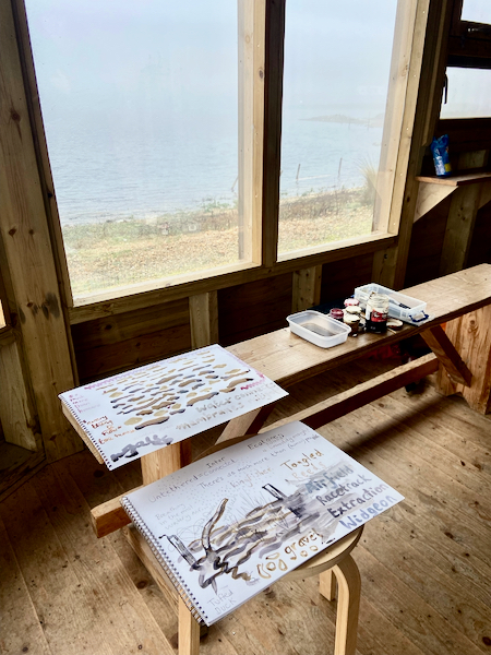 Lastly we ended up in a large glass fronted hide which overlooks the biggest lake at Blashford, Ibsley Water. Inside we paused to write and draw with soil paint made by Gemma and some of my botanical inks, and then Gemma read from a piece of hers called A Cave (2011), from an earlier body of work focusing on underground/geology.