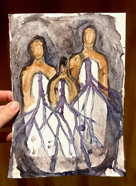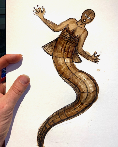 I’ve included some other recent drawings here too. One draws on the connections between my family (me, my husband and our son), the second continues to look at watery human-animal hybrids by combining eel and human bodies (see Mermen, Otters and Bears), and a third looks ahead to an exhibition I’ll be having in the Summer, in which I plan to include some sculptural pieces.