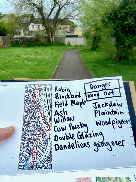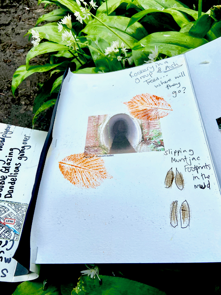 I took a longer walk than we will as a group, as I wanted to get a feel for the whole of the Brook as it passes through the town, so had less time to stop, listen, notice and record than we will in August, when we can pause for longer and include more detail on our pages. Today I concentrated on making notes and layering printed photos with rubbings and printing