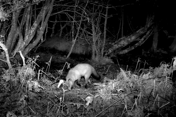 While at the restored stretch of river near Wootton Bridge, I recorded animal tracks onto pages from charity shop botany books, and set up my camera trap to find out what had been feeding on spawning frogs. The image below is taken from the resulting footage of a munching fox.