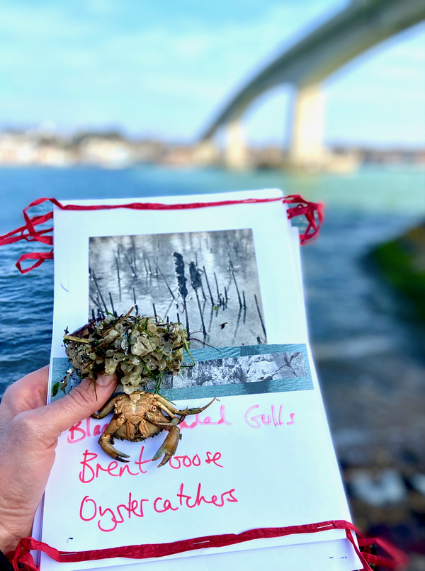 On my way I carried with me some Walking Pages that consisted of black and white photographs of wetland and marine wildlife and waterside buildings, connected with red paper tape in a way that reminded me of flags. As I walked, I recorded the names of the animals that I noticed in red pen, both alive and dead. The walk with Alys, and the making of these pages have helped me to form ideas for the work that I’ll be carrying out at the gallery, both individually and with the public.