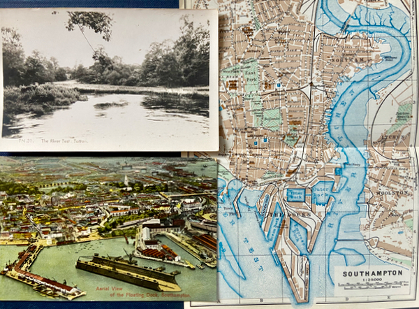 What quickly struck me as we walked, as well as the restricted access to the waterside, and the way that industry dominates the city, was a lack of the liminal, in-between spaces that I’d usually expect at the coast or alongside a river. In the places that I visited, water meets the straight edges of urban development. No beaches, marshes or gradual evolution from land into water, but an abrupt and artificial ending. As Alys pointed out, much of Southampton’s waterside is still very active industrially, in contrast to other cities where post-industrial areas have been repurposed or regenerated for leisure or as cultural venues. Since our walk I’ve been sourcing old photos and maps of the city that relate to its rivers and waterfront, and tell a little of their story.