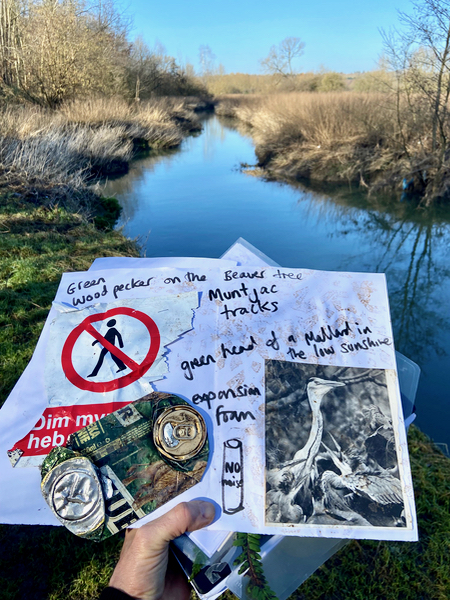 The three sets of Walking Pages shown here document three different walks with the River Biss, between December 2024 and March 2025. These are starting points really, ways of letting the place speak to me, and noticing my response. They layer text that records what I notice in the moment, with drawings and rubbings of riverside walls/signs/manholes etc, found imagery, and objects offered up by the river.