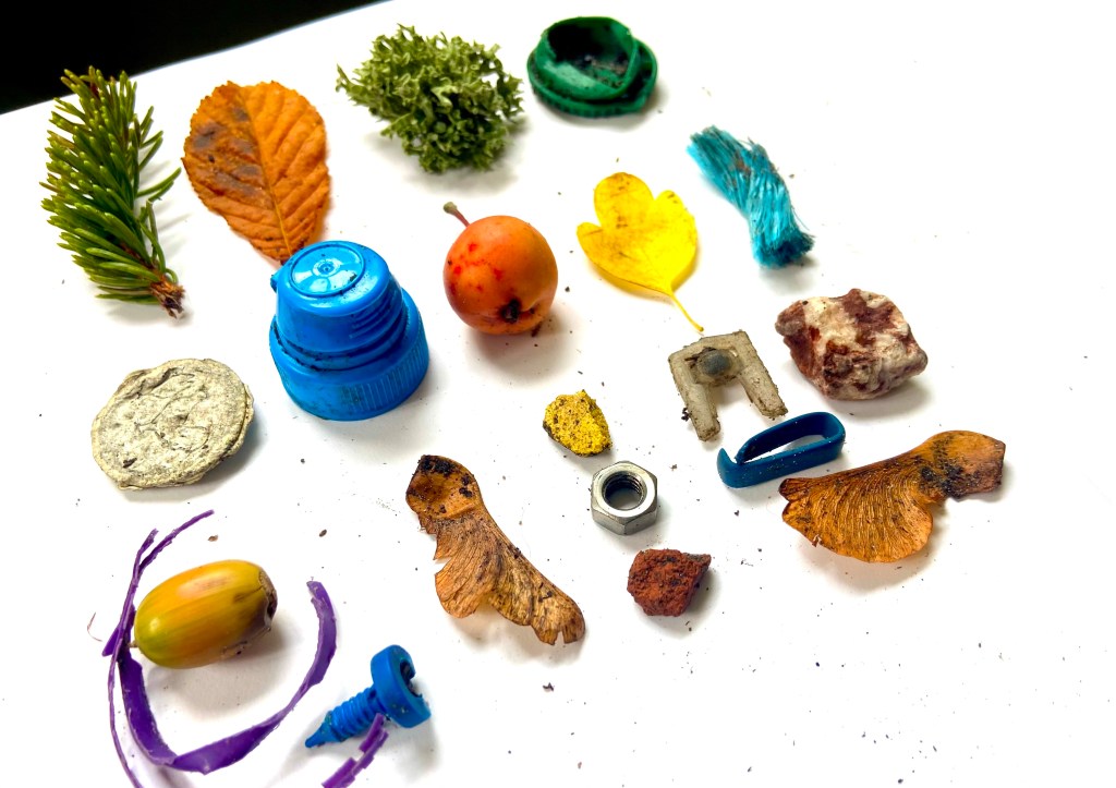 I took a walk after one of the first bursts of rain, and gathered a few things that had been washed up. I walked from my home along the road to the river bridge, tucking headlight plastic, pieces of yellow line and the odd seed or feather into my pocket. I’ve written about Roadcombing before, and the place of collecting in my practice, but not really about run off from our roads into rivers. The water is very welcome of course, and I can pick up a certain amount of rubbish, but after a long dry period what less visible stow-aways does the water carry with it?