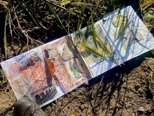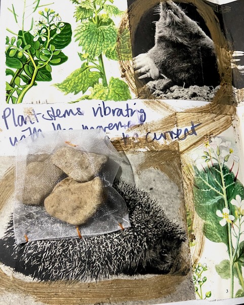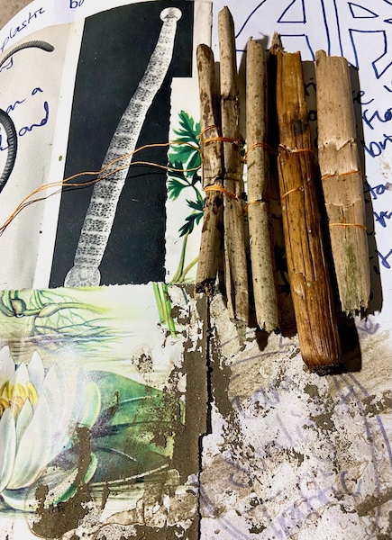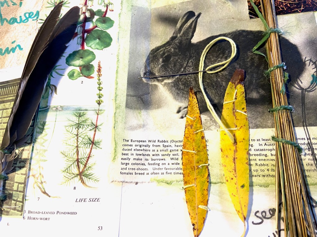 I’ve been using Walking Pages to document and process these walks. My Walking Pages vary, but generally consist of a series of paper pages that connect together in a linear way, recording what I notice as I walk. For these recent walks I’ve been using a fold-out concertina format, made up of six A4 white paper pages overlaid with collected botanical, architectural and other imagery that link to the subject matter of river wildlife and human infrastructure. Onto this surface I write, draw, make rubbings, and attach objects washed up by or left along the river, stapled in the moment or dried out and stitched on later in my home studio.