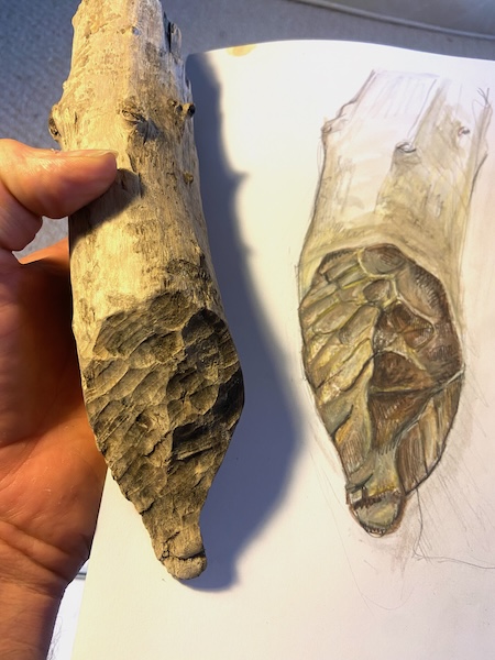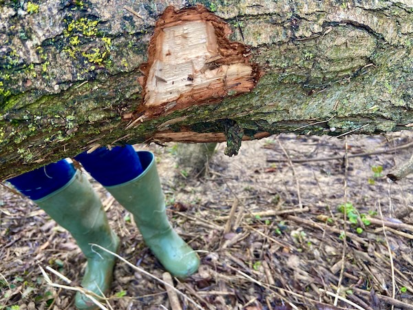 These walks are also helping me to develop my understanding of where beavers are living in Wiltshire, as I research human-beaver relationships, and beavers as makers. I log any signs I find of beavers as I walk, and upload my photographs to the Mammal Mapper App to contribute to county records. I also collect fragments of beaver chewed wood, to draw back in my studio, as a way of looking even more closely, or make scans of them to use later in artwork (video, installation etc).