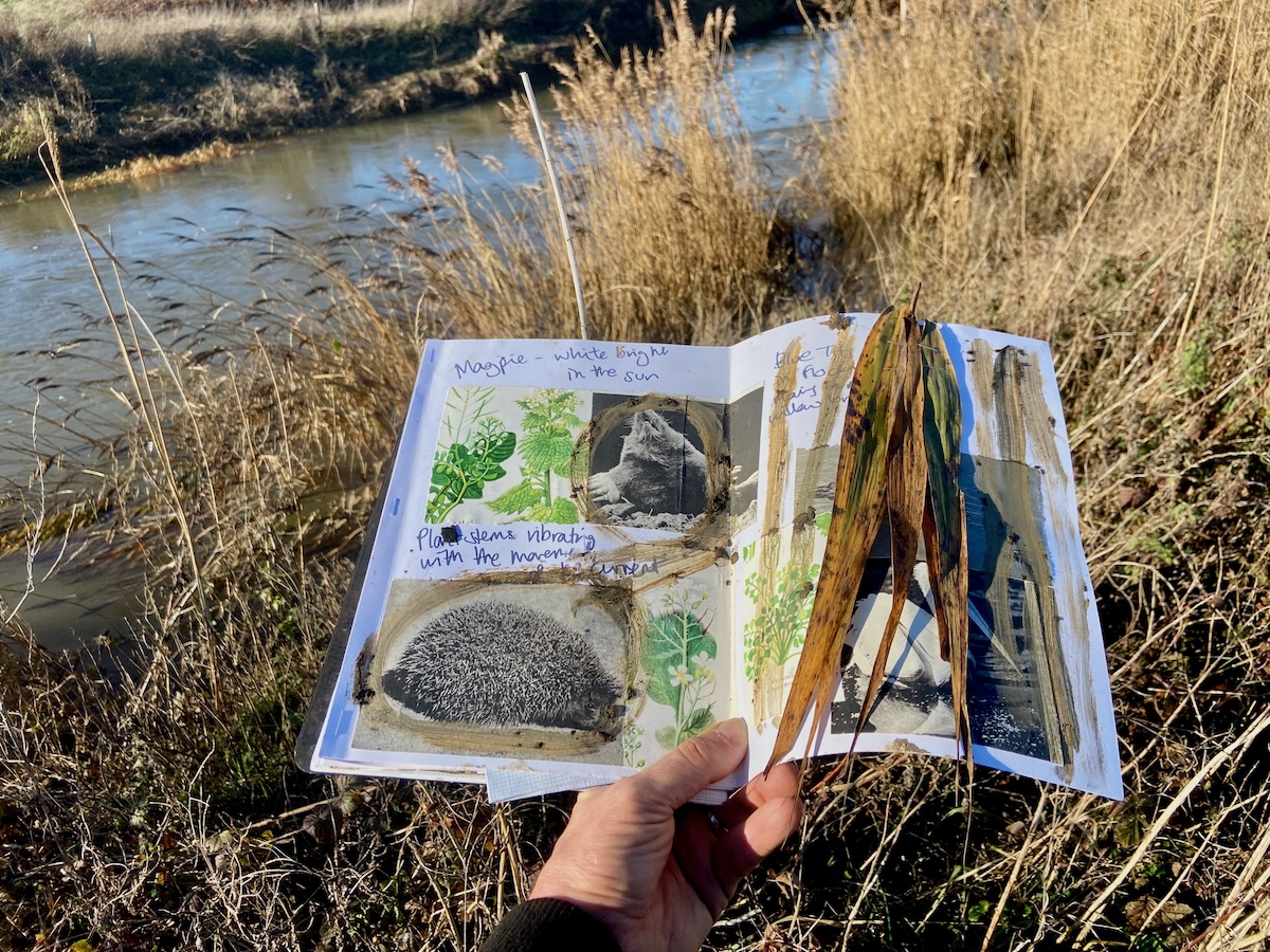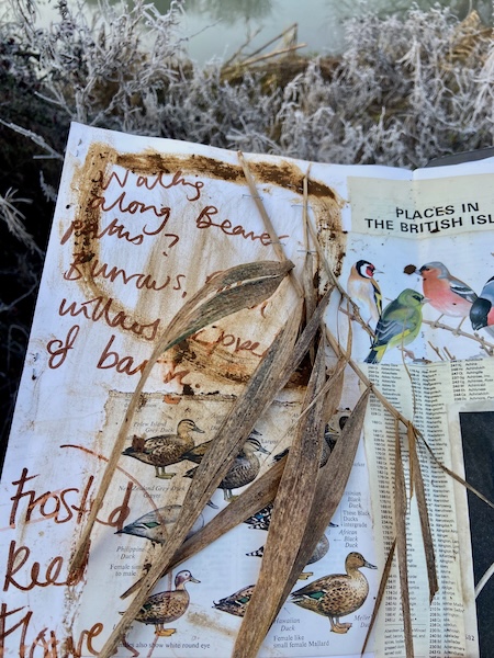 The printed illustrations, representing the idea of the ‘official’ British landscape, blend with the messy, multi-sensory and emotional responses that emerge in the moment, and what the river shows me. This includes a rough list of the mammal/bird species that I see, hear or notice tracks/signs of, and some of the plants too.