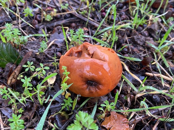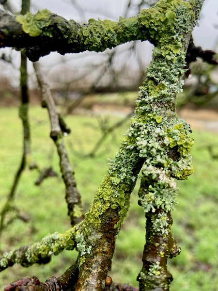 When we met the apple trees of a riverside orchard, Ann-Marie used a lens to magnify the lichens living on their branches. Viewed on a different scale, we saw their water-holding cups and fine spikes. Ann- Marie has worked with orchards regularly over the years and her experience brings a different insight and a deeper knowledge than me. Projects have included Flow, an 8 years old, ongoing project centred on ‘a ribbon orchard of 193 trees’ in the Riverside Park area of Exeter, with programmes of cultural events throughout the seasons, and Fruit Routes at Loughborough University ‘an edible campus (of) …fruit and nut trees along walking and cycle routes across the University Campus’.