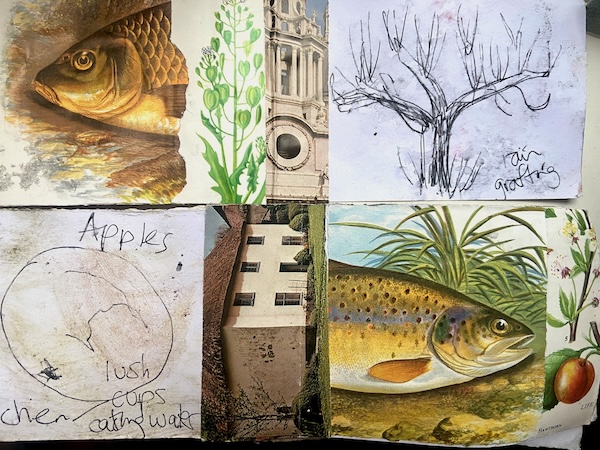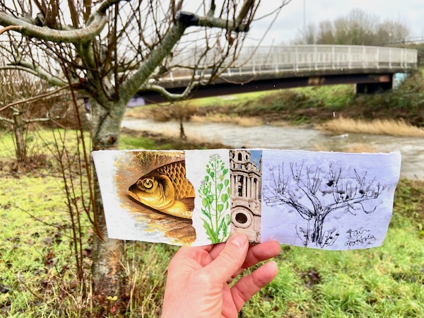 Ann-Marie and I walked from the station down to the banks of the Tone, and paused under the first bridge, where I shared some ‘fish cards’ that I had made for us to use, a form of Walking Pages, collaged together using imagery from charity shop finds. Everything was getting pretty soggy by then, so writing/drawing wasn’t easy, and we ended up rubbing on earth and lichen, and letting raindrops join in with pen sketches.