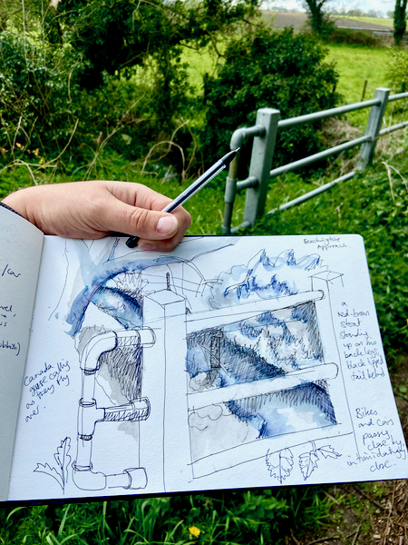 We planned to start and end our walk together with a Zoom conversation on our phones, and in between to share what we each noticed using sound recordings, photos and video sent via WhatsApp. I also suggested to Andy that we use drawing to record our experiences. Andy and I both draw on backgrounds in the arts and the environment, though having followed different paths through education that draw these threads together.